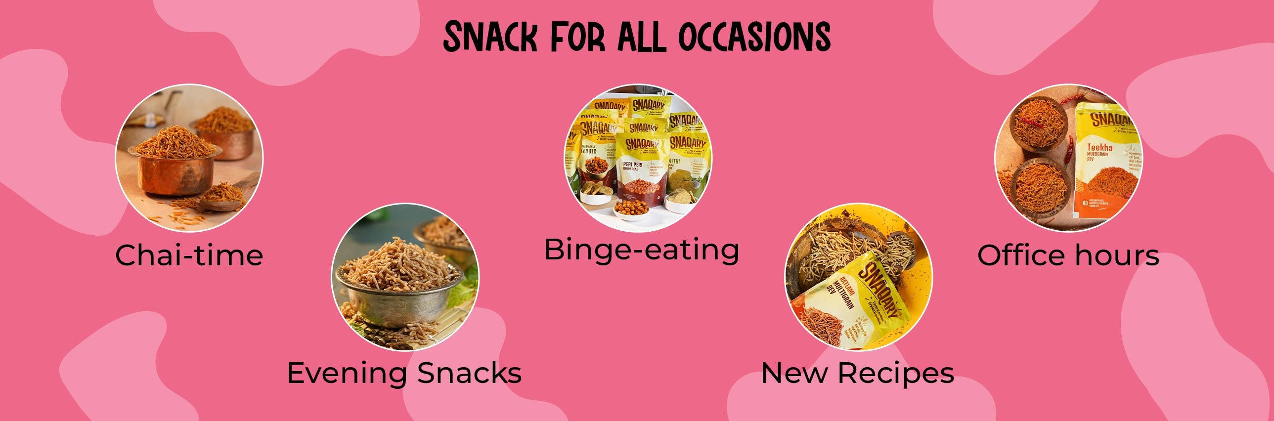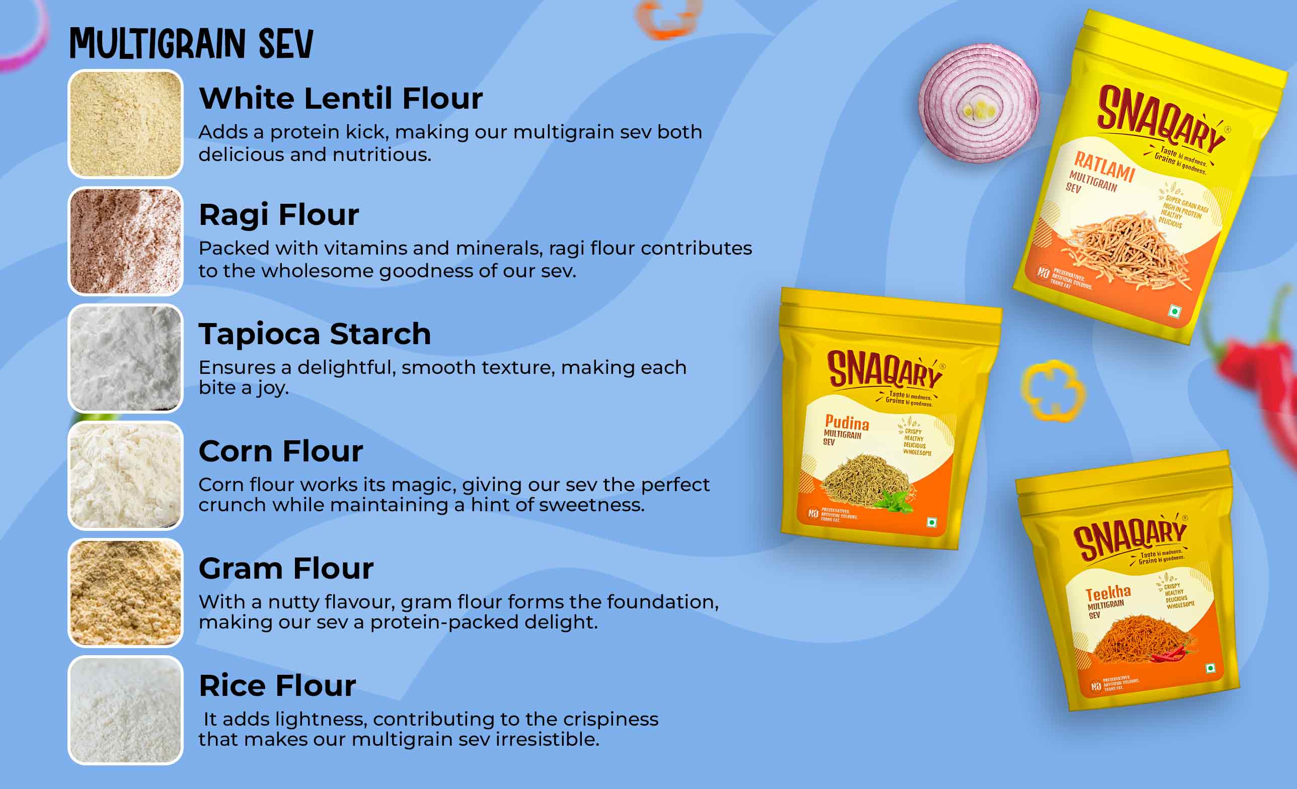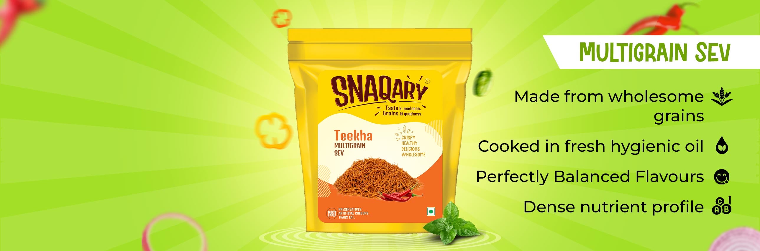 Snaqary Multigrain sev is a type of savoury Indian snack made from a mixture of different grains and spices. It is typically shaped into thin noodles or strands and deep-fried until crispy.