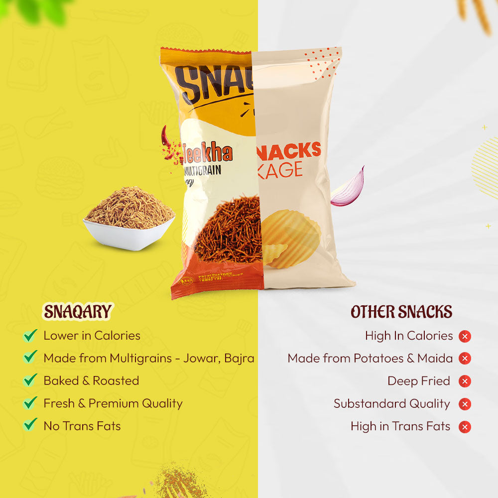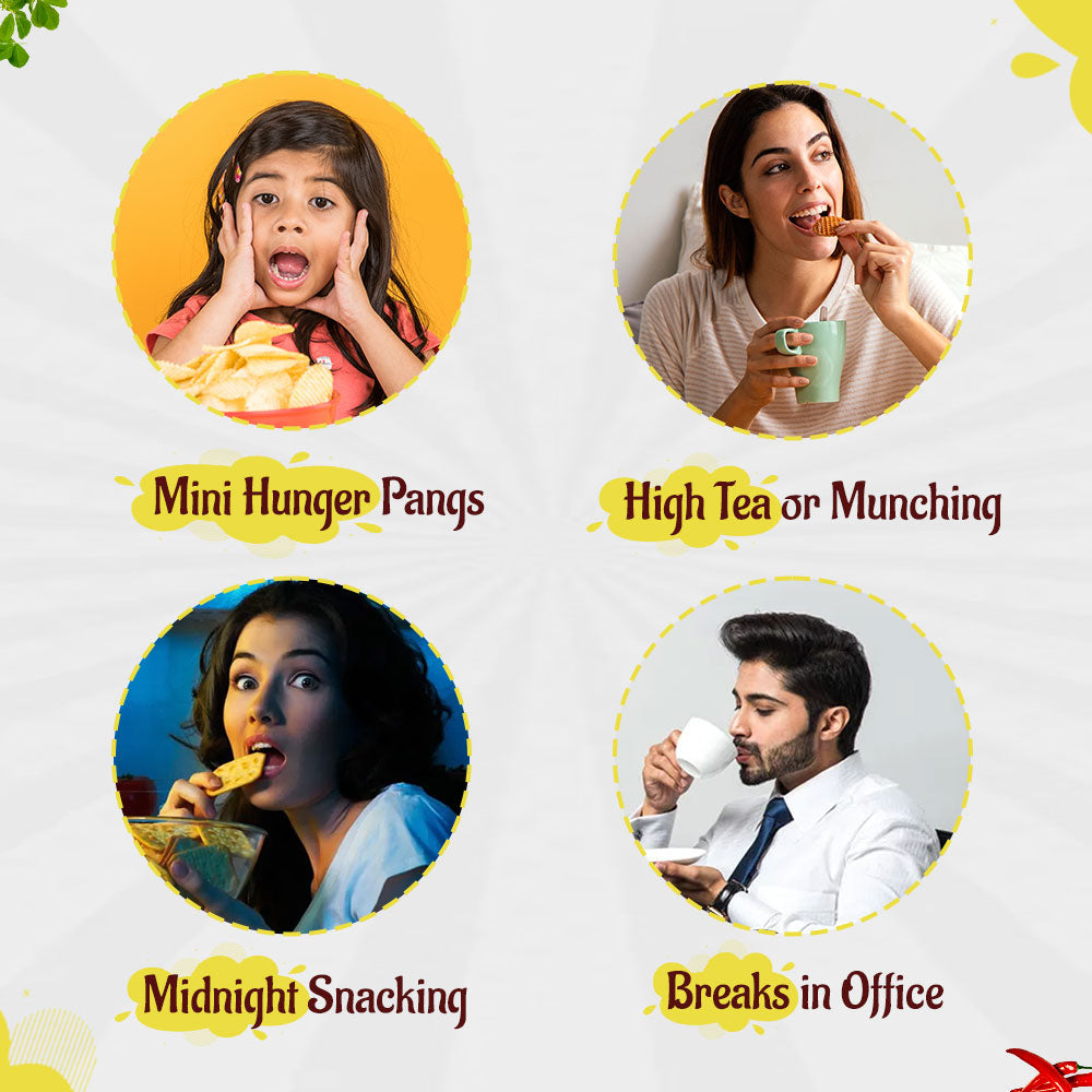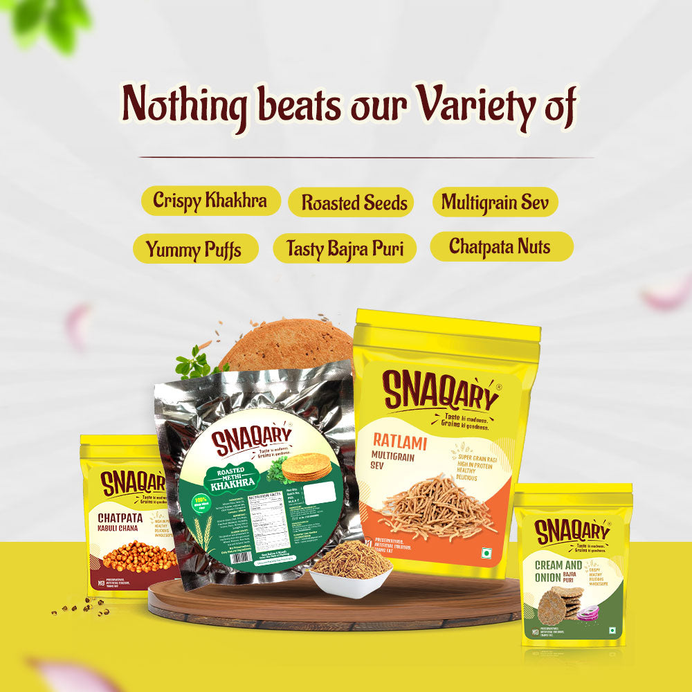 Experience a tantalizing assortment of snacks including Methi Bajra puri, Peri peri Bajra puri, Palak Bajra Puri, Jeera Bites, Teekha Multigrain sev, Pudina Multigrain sev, Peri peri Multigrain sticks, Chaat Multigrain sticks, Soya Masala Peanuts, and Nuts Mix. Indulge in a burst of diverse flavors and textures, perfect for snacking enthusiasts and those seeking a variety of delicious treats. Start your snacking adventure with this exciting Snack Starter Kit today!